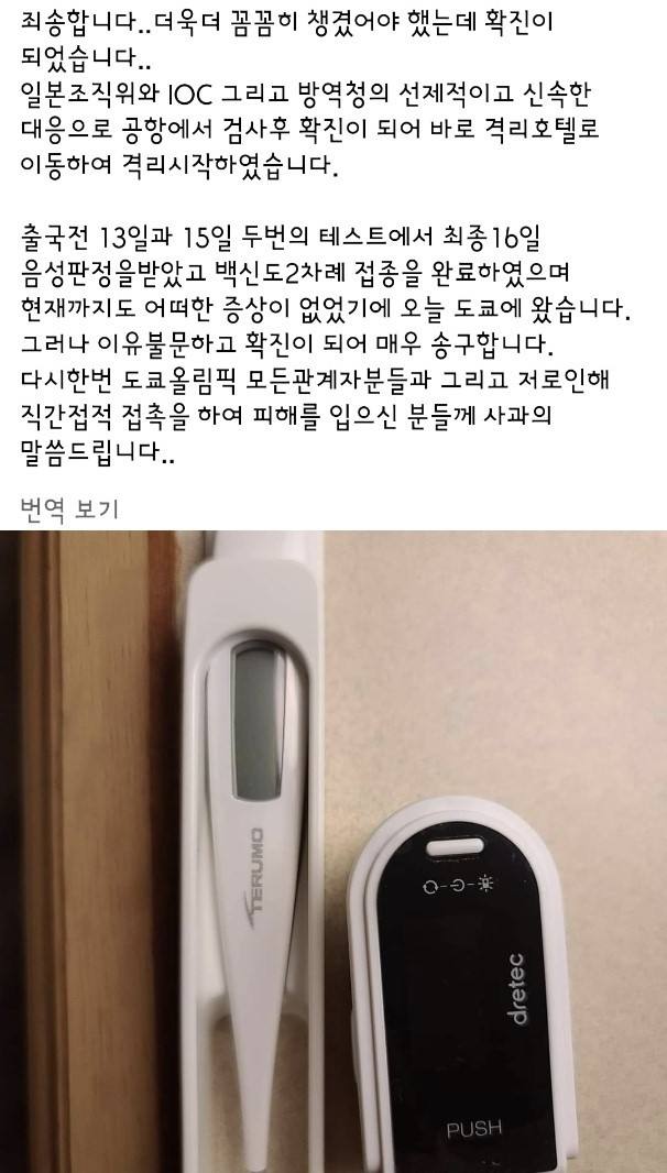 유승민 IOC 위원은 "출국 전인 13일과 15일, 두 번의 (코로나19) 검사를 받은 뒤 16일 최종 음성 판정을 받았고 백신도 2차례 접종했다"며 "현재까지도 증상은 없다"고 설명했습니다.