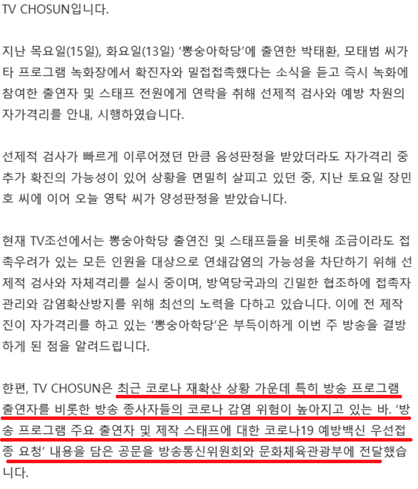 TV조선은 19일 장민호에 이어 영탁의 코로나19 양성 판정 결과를 밝히며, "최근 코로나 재확산 상황 가운데 특히 방송 프로그램 출연자를 비롯한 방송 종사자들의 코로나 감염 위험이 높아지고 있는 바 '방송 프로그램 주요 출연자 및 제작 스태프에 대한 코로나19 예방백신 우선접종 요청' 내용을 담은 공문을 방송통신위원회와 문화체육관광부에 전달했다"고 전했습니다.