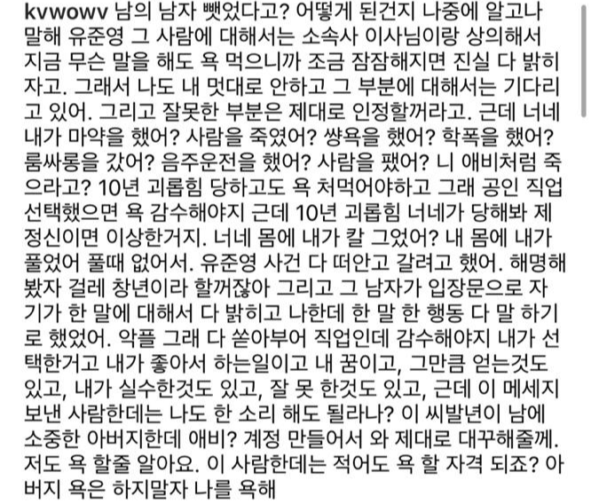 권민아는 "잠수 타지 말고 연락해라. 거짓말한 거 다 밝히겠다고 해놓고서는 전 여자 친구한테 돈 빌린거에 대해서만 적었더라? 난 몰랐던 사실이었다만"이라며 "전 여친 뒷담화 미친듯이 까고 연락 안 하고 사이 별로인지 오래됐고 이러쿵 저러쿵 힘든 거 다 이야기해놓고 동정심 다 만들어 놓고"라며 유준영을 저격했습니다.