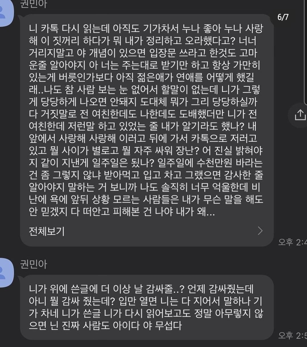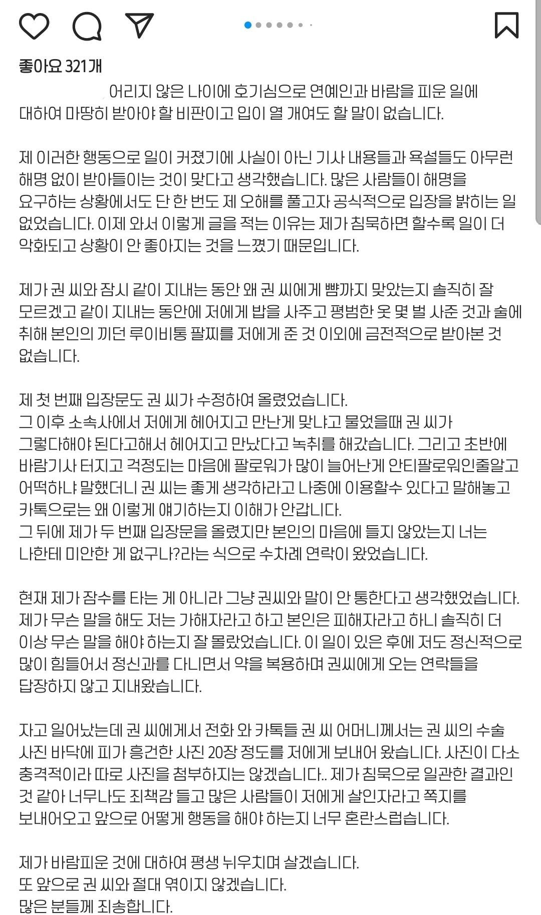 이어 "제가 권씨(권민아)와 잠시 같이 지내는 동안 왜 권씨에게 뺨까지 맞았는 솔직히 잘 모르겠고 지내는 동안에 저에게 밥을 사주고 평범한 옷 몇 벌 사준 것과 술에 취해 본인이 끼던 루이비통 팔찌를 저에게 준 것 이외에 금전적으로 받아본 것 없다"고 했습니다.