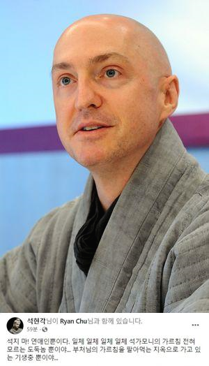 현각스님은 페이스북 게시글에 혜민스님 사진과 함께 "석지 마! 연애인 뿐이다"며 "일체 석가모니의 가르침 전혀 모르는 도둑놈뿐이야"라고 비판했습니다. 그러면서 "부처님의 가르침을 팔아먹는 지옥으로 가고 있는 기생충뿐이야"라고 더욱 강도를 높였습니다. 그는 다른 게시글에서는 "현제(재) 한국불교는 정말정말 X같은 불교다"라고 주장하기도 했습니다.