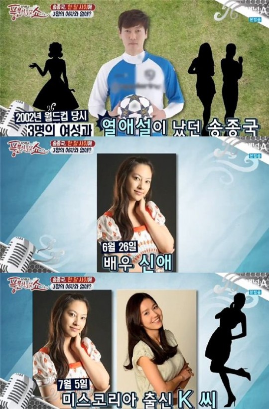 송종국은 "내가 아니다. 당시 스캔들이 연이어 터진 바람에 루머로 이어졌다"고 설명했지만, 김성주는 "이진 씨였나, 성유리 씨였나?"라고 당시 스캔들을 직접 언급했고, 안정환은 "좋았겠다"며 맞장구를 쳐 송종국을 당황하게 했습니다.