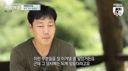송종국은 지난 29일 방송된 MBN 교양프로그램 '현장르포 특종세상'에 출연해 강원도 홍천에서 자연인으로 지내는 일상을 보여주었습니다.