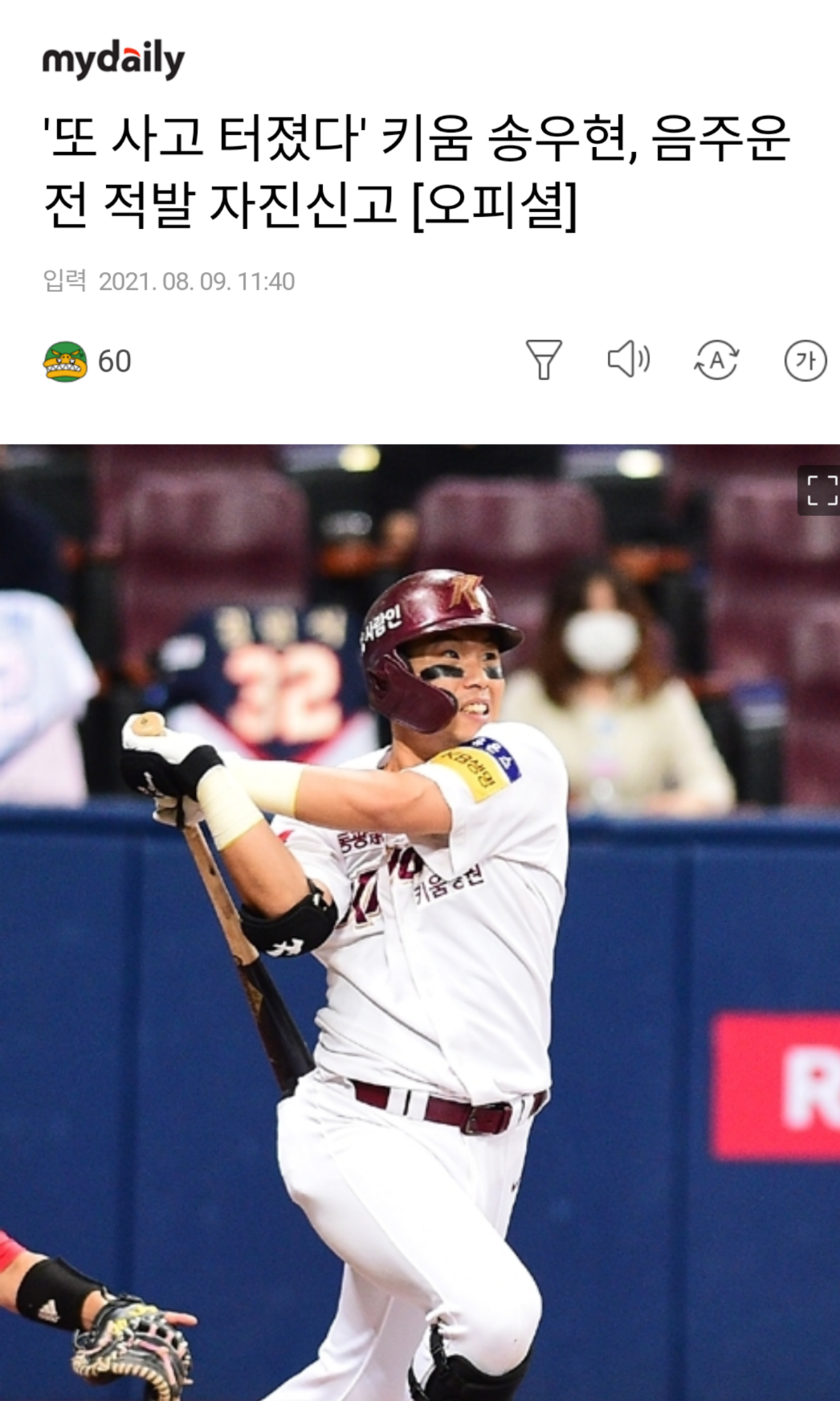 키움 히어로즈 외야수 송우현이 음주운전으로 적발된 사실을 자진 신고했는데요, 자세한 내용 알아보겠습니다.