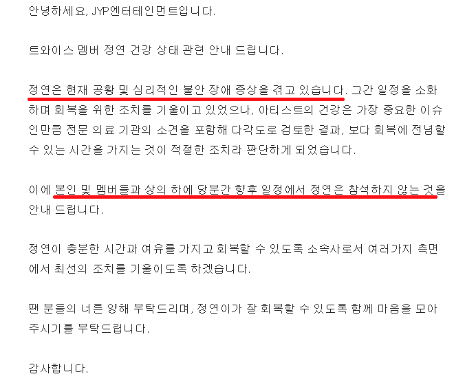 트와이스 정연의 소속사 JYP엔터테인먼트는 18일 공식입장을 통해 "정연은 현재 공항 및 심리적인 불안 장애 증상을 겪고 있다"며 정연의 건강 상태를 알렸습니다.