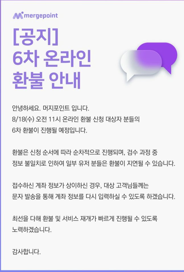 머지포인트 운영사인 머지플러스 측이 이용자들을 대상으로 순차적으로 돈을 돌려주겠다며 6차까지 환불을 진행했다는 입장이지만 인원이나 환불액 규모 등 추후 환불 일정에 대해 밝히지 않고 있어 피해자들의 애만 태우고 있습니다.