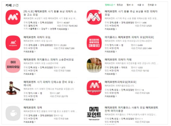 머지포인트 관련해 대책을 논의하는 온라인 커뮤니티는 네이버에만 20여 곳에 이르는 것으로 확인되었습니다. 특히 '머지포인트 사기 환불 피해자 소송 보상 커뮤니티'의 회원 수는 무려 4만명에 달하고 있습니다.