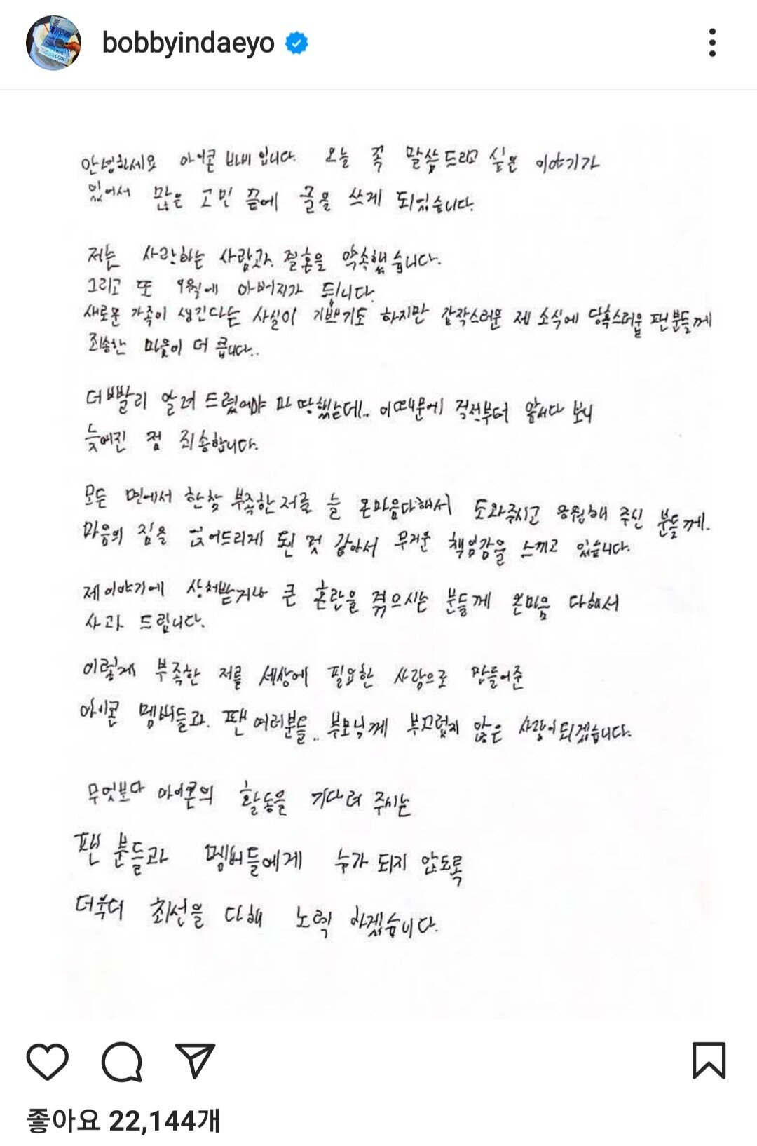 열애와 결혼, 임신을 동시에 발표하는 손편지. 갑작스러운 소식에 팬들은 물론, 일반 누리꾼들 역시 당황스러움을 표출하고 있습니다. 이로써 바비는 아이콘 1호 유부남이 되었는데요, 바비가 직접 손편지에 밝힌 것처럼, 그는 아빠가 된 이후로도 아이콘 활동을 이어갈 전망이라고 합니다.