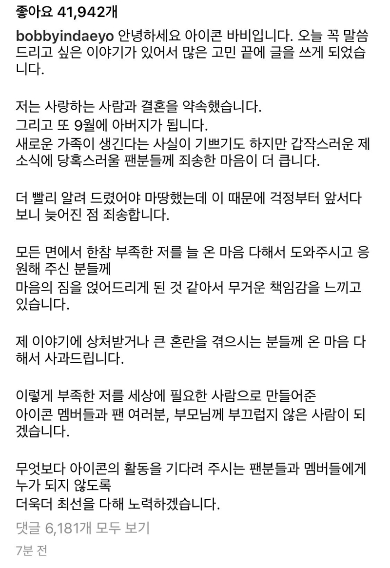 아이콘 바비 결혼 발표 입장 전문