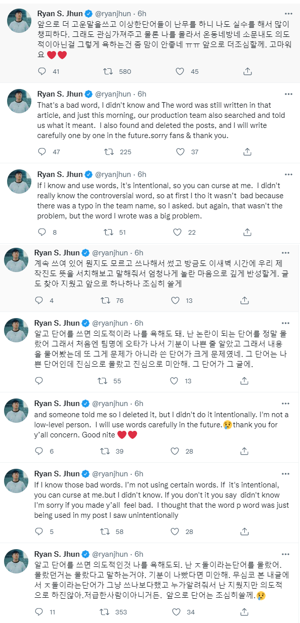 이어 "(내가) 알고도 단어를 쓰면 의도적이라고 나를 욕해도 돼. 난 논란이 되는 단어를 정말 몰랐어. 그 단어는 나쁜 단어인데 진심으로 몰랐고 미안해"라고 해명했습니다.