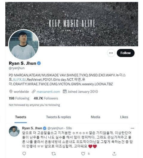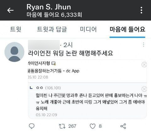 라이언전은 11일 자신의 트위터 계정을 통해 여자 아이돌 비하, 성희롱 단어를 사용한 데 깊이 사과했습니다.