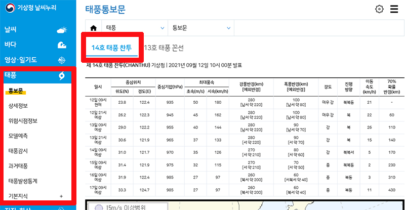 기상청 홈페이지 좌측에 태풍을 누르면 14호 태풍 찬투의 실시간 이동경로와 상세 정보를 알 수 있습니다.