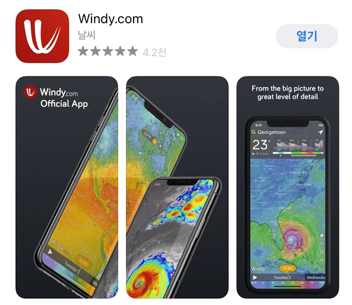 실시간 날씨 정보와 태풍 위치를 알 수 있는 어플 윈디(windy)입니다. 어플 윈디를 다운로드하시거나, 컴퓨터에서는 windy.com을 치면 실시간 태풍의 위치를 확인할 수 있습니다.