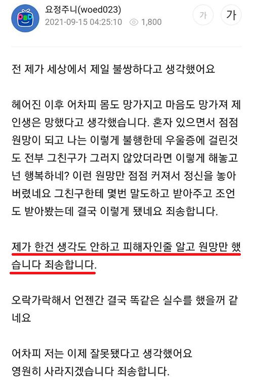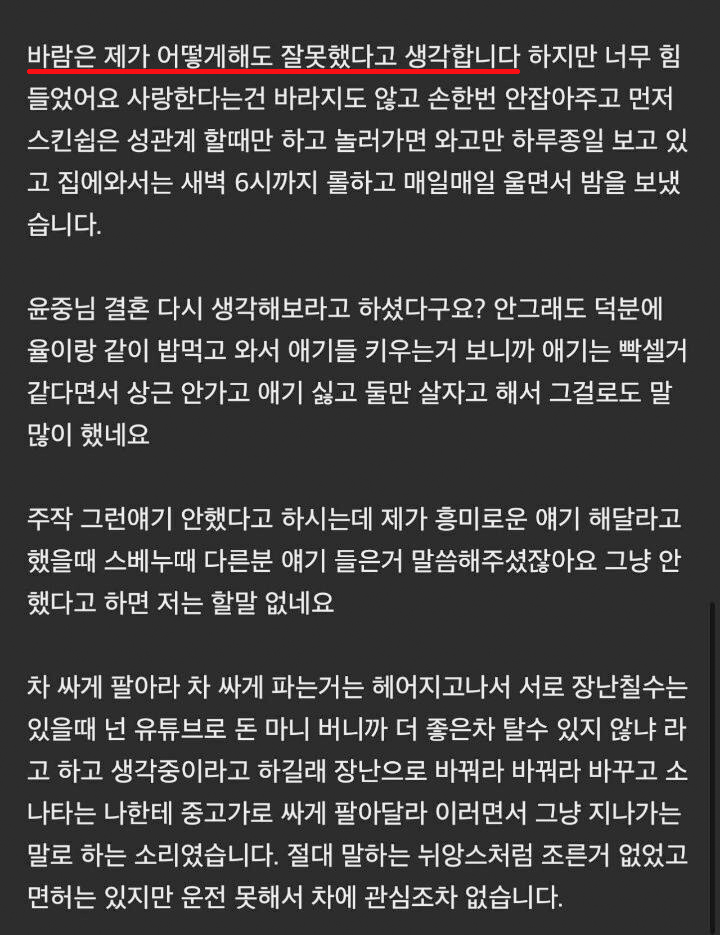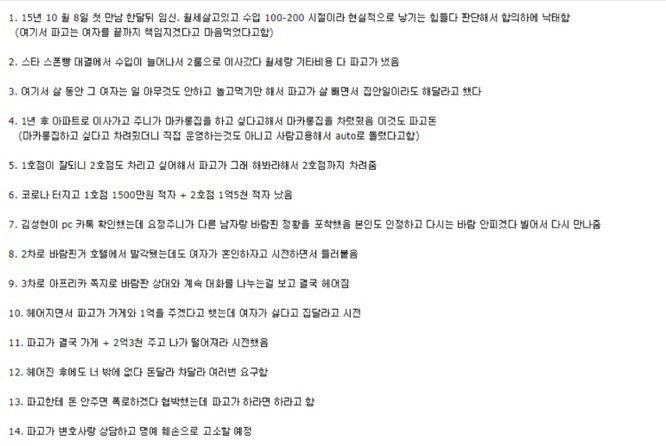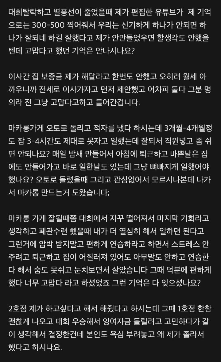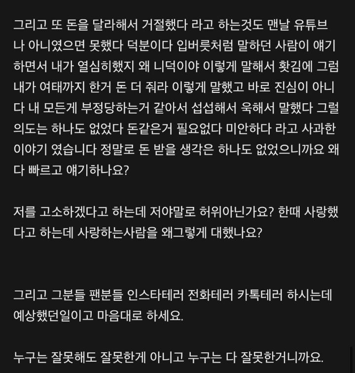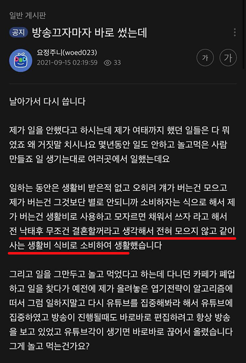 그러면서 "요정주니의 원룸 보증금과 월세를 내줬으며, 일을 열심히 하는 동안 요정주니는 일을 그만두고 아무것도 안했다"고 덧붙였습니다.
