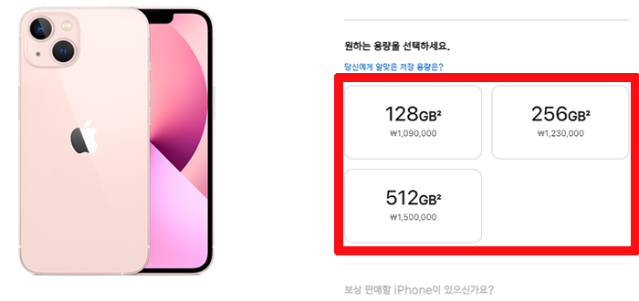 아이폰13 가격은 용량에 따라 ▲128GB 1,090,000원, ▲256GB 1,230,000원, ▲512GB 1,500,000원으로 나뉩니다.