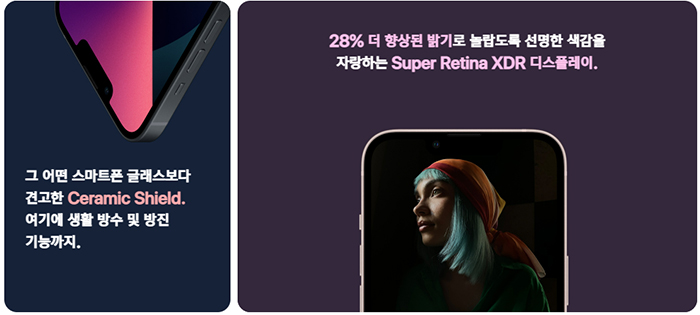 아이폰13은 일반 스마트폰 강화 글래스보다 내구성이 뛰어난 Ceramic Shirld가 설치됐으며 IP68등급 방수도 빠짐없이 적용되어 있습니다.