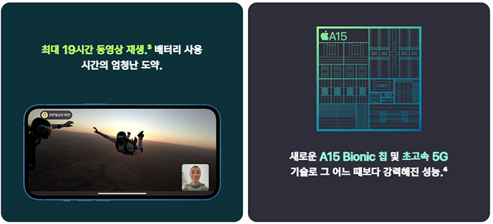 아이폰13 제품 사양은 5나노 공정으로 제조한 A15 바이오닉을 탑재해 배터리 수명을 늘렸습니다. 애플에 따르면 아이폰13 미니와 아이폰13프로는 이전 모델 대비 배터리 수명이 1.5시간, 아이폰13과 아이폰 13프로 맥스는 배터리 수명이 2.5시간으로 대폭 늘어났습니다.