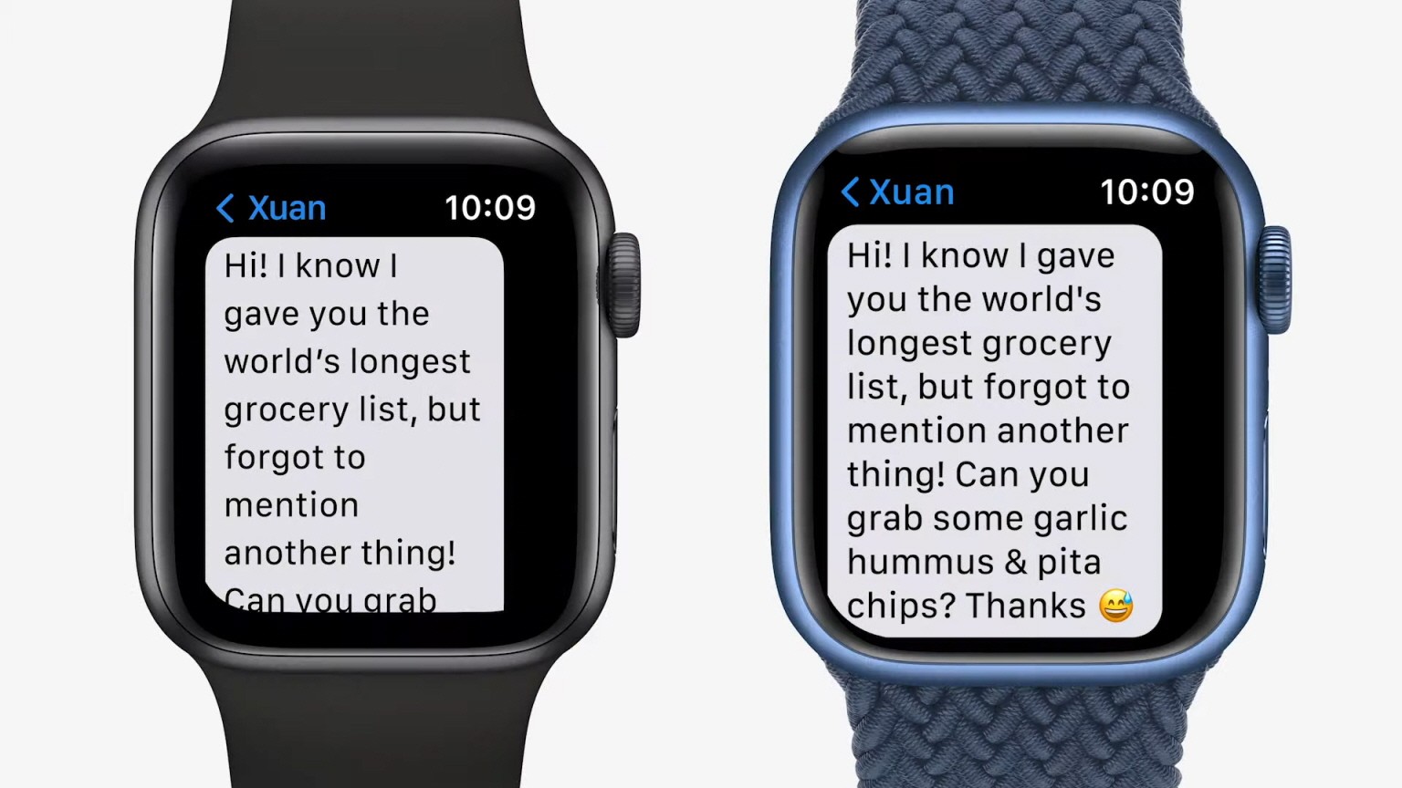 애플워치7은 화면 영역이 전작보다 약 20% 커졌으며, 테두리는 1.7mm로 줄었습니다. 시계 본체 크기는 유지하면서 화면을 최대화한 모습이었는데요, 덕분에 더 많은 양의 텍스트를 표시할 수 있게 되었습니다.