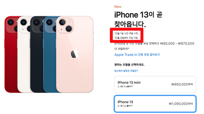 아이폰13 사전예약 날짜는 10월 1일부터 주문을 받아 8일부터 공식 판매에 들어간다고 합니다. 인기 색상의 경우 오픈 당일에 초도 물량이 동날 수 있어 아이폰13 예비 구매자라면 사전예약을 잘 노려야 할 것 같습니다.