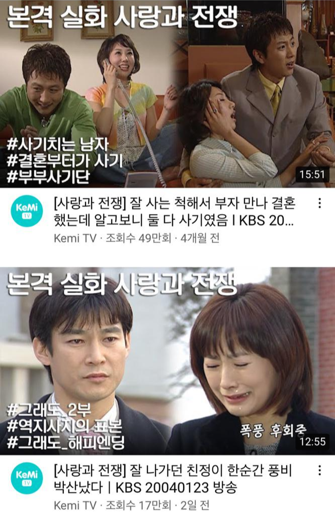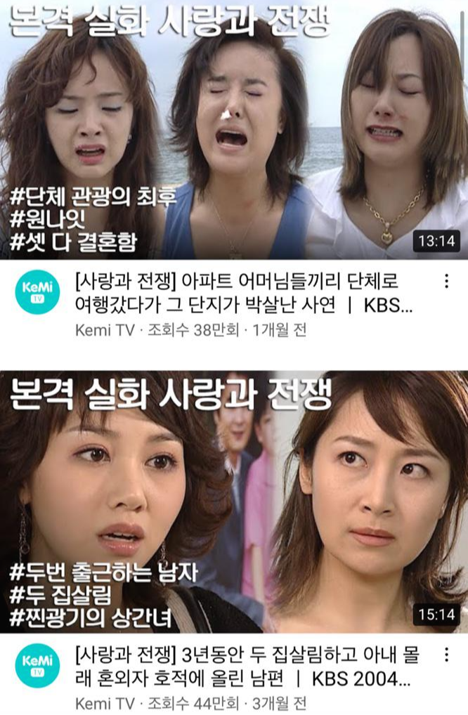 과거 에피소드를 짧게 편집한 사랑과전쟁 유튜브 영상은 20~30대의 관심 속에 50여 개의 영상이 100만 뷰 이상의 조회수를 기록했다고 하는데요, 해당 채널의 누적 조회수는 2억 6천만 회에 달한다고 합니다.