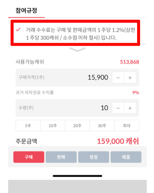 마켓 | 옥션 마감 후 회원간 자유롭게 거래가 가능한 시장 -체결 기준, 1주당 1.2%(상한가 300원) 거래 수수료 발생 -5주 이상 구매 주문 시, 1주당 1.0%(상한가250원)으로 할인 적용 |
