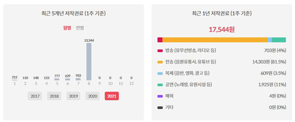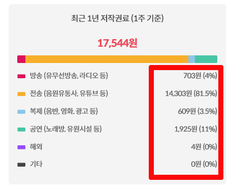 앞서 말씀드렸다시피, 뮤직카우는 개인 투자자가 저작권료 지분 장기보유 시 연 8.0%의 높은 수익률을 달성할 수 있는 것이 장점인데요, 또한 어디서 얼마의 수익이 발생했는지 한눈에 알아보기 쉬워 초보자들도 쉽게 파악할 수 있습니다.