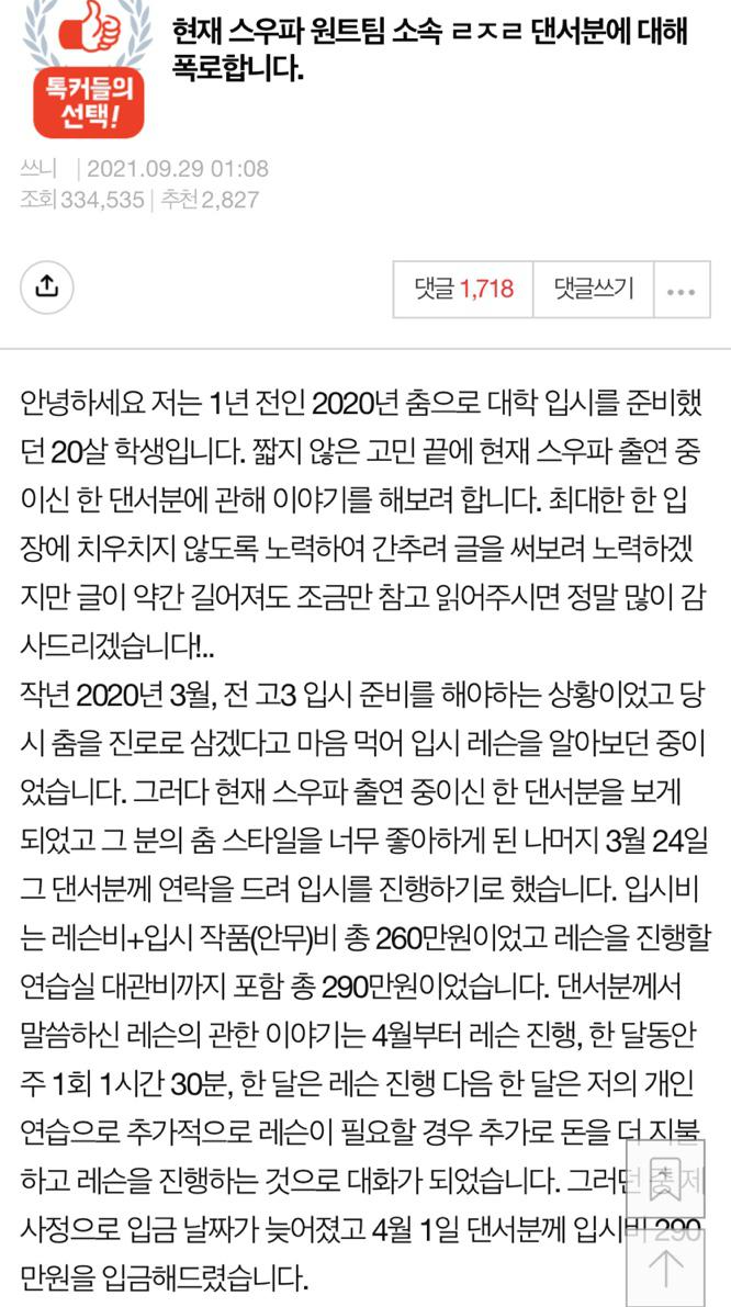 글쓴이 A씨는 스트릿 우먼 파이터에 출연 중인 댄서에게 지난해 입시 레슨을 부탁했다가 레슨도 받지 못하고 레슨비를 돌려받지 못했다고 주장했습니다.