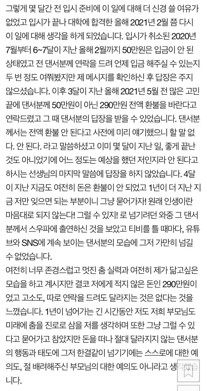 해당 폭로 글에 따르면, 지난해 3월 춤으로 진로를 정한 A씨는 고3 입시 준비를 위해 댄스 레슨을 알아보다, 로잘린에게 레슨을 받기로 하고 입시 레슨비 290만 원을 지불했다고 합니다.