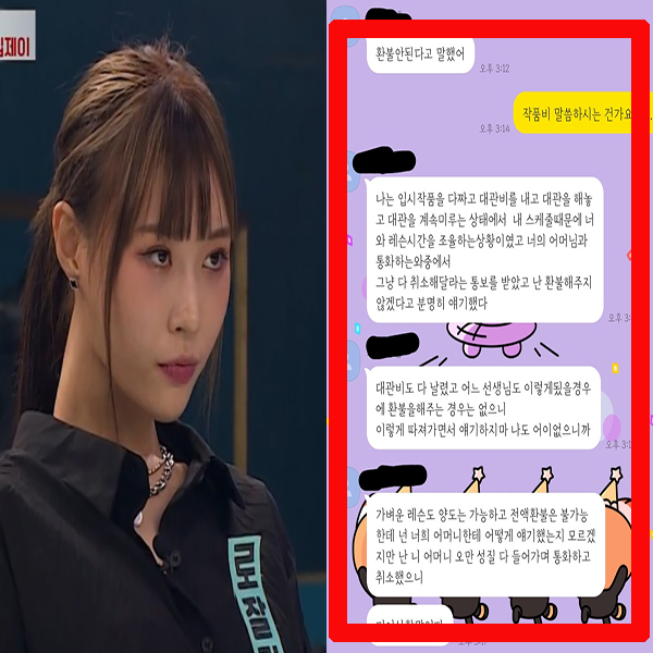 전화 통화에 기분이 상한 로잘린과 A씨의 부모님의 말싸움이 오갔고 결국 로잘린은 "그럼 어떻게 환불해드려요?"라고 말했다고 하는데요, 로잘린은 이미 입시 작품을 창작했기 때문에 작품비는 환불해 줄 수 없고 레슨비 50만 원만 환불해주겠다고 했지만 현재까지 50만 원도 돌려받지 못했다고 주장했습니다.