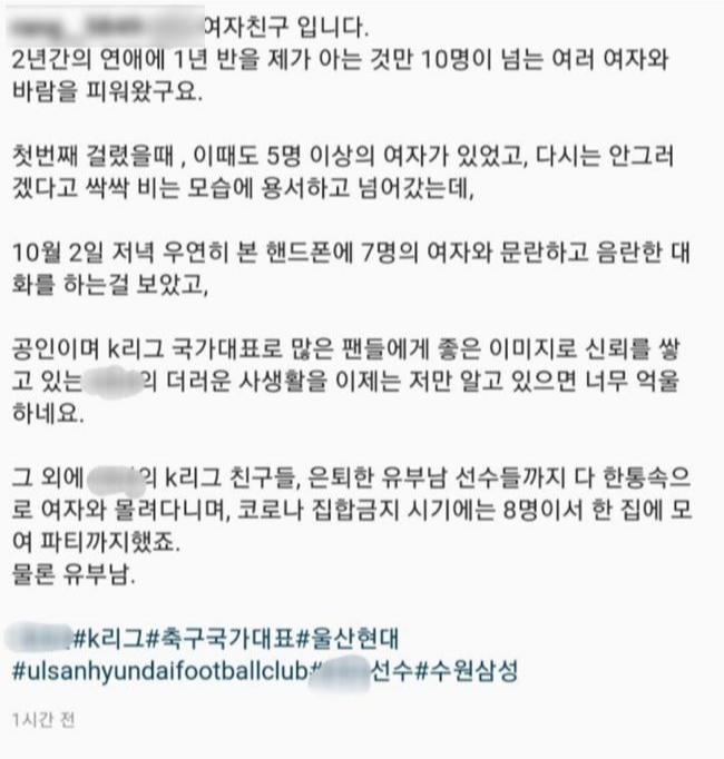 지난 4일 축구선수 홍철의 여자친구 A씨는 인스타그램을 통해 홍철이 교제한 1년 반 동안 다수 여성과 바람을 피웠다고 폭로했습니다.