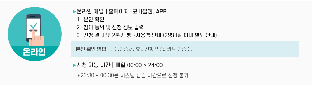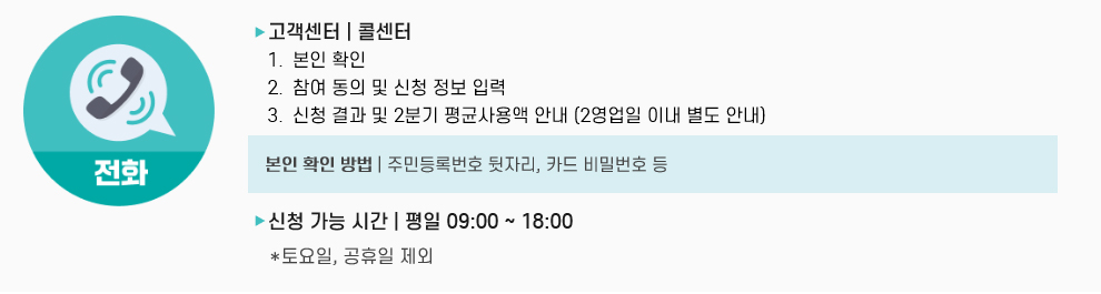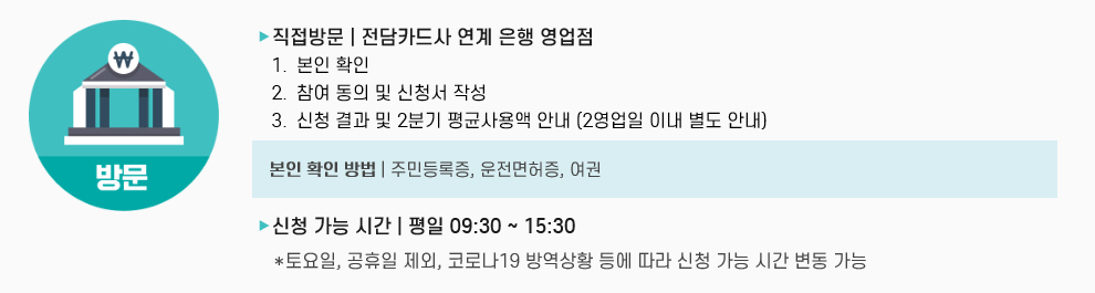 9개 카드사 중 1개 카드사를 전담카드사로 지정하고 카드사의 홈페이지(또는 모바일앱 포함), 고객센터(콜센터), 카드사 연계 은행 영업점을 통해 참여 신청이 가능합니다.