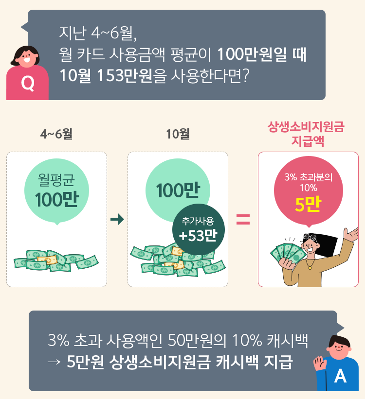 예를 들어 2분기 월평균 사용액 100만 원, 10월 카드 사용액이 153만 원이면 증가액 53만원 중 3만 원(3%)을 제외한 50만 원의 10% 5만 원을 캐시백으로 받을 수 있으며, 같은 사람이 10만 원을 다 돌려받으려면 10월에 203만 원을 써야 합니다.