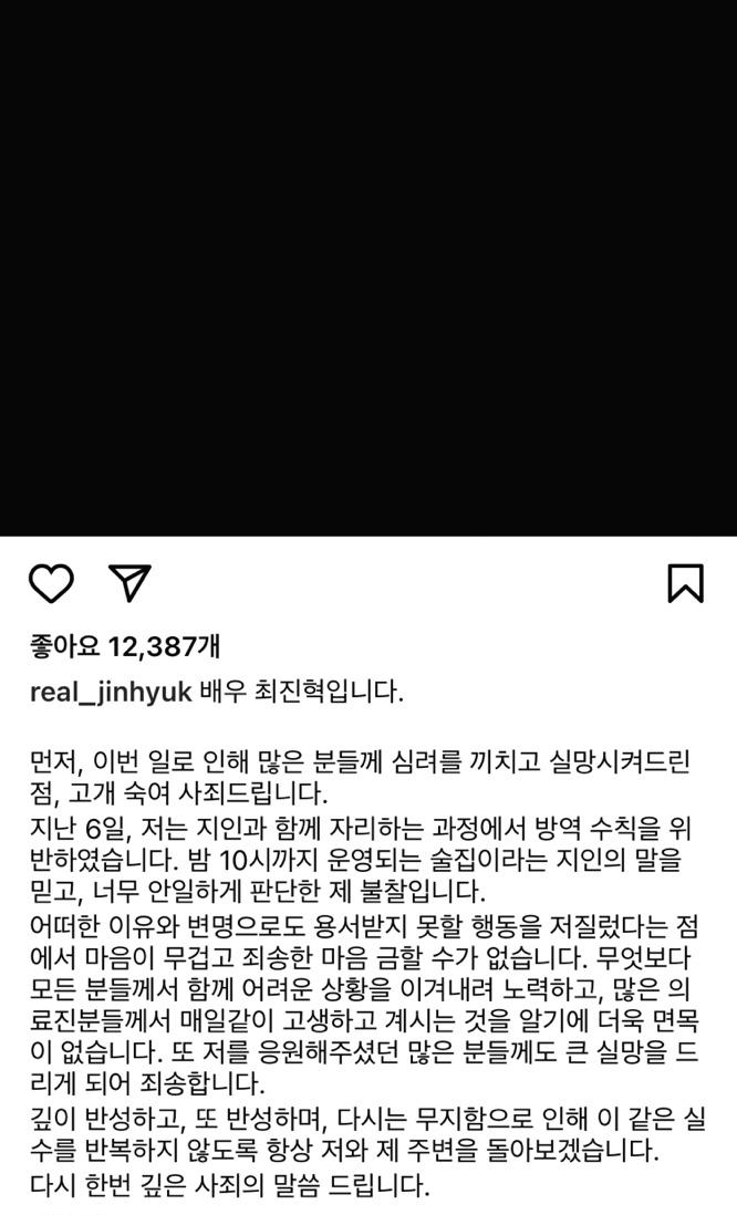 최진혁은 이날 본인의 인스타그램에 "어떠한 이유와 변명으로도 용서받지 못할 행동을 저질렀다는 점에서 마음이 무겁고 죄송한 마음 금할 수가 없다"며 사과문을 게재했습니다.