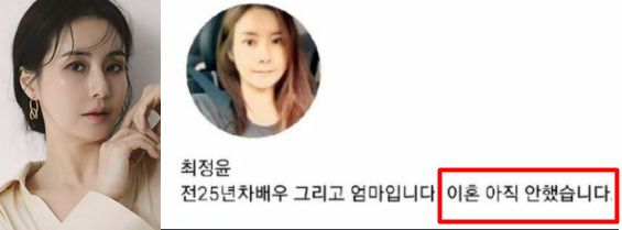 이 소식이 전해진 후 최정윤은 자신의 인스타그램에 "전 25년 차 배우 그리고 엄마입니다. 이혼 아직 안 했습니다"란 문구를 게시했는데요, 하지만 이후 "이혼 아직 안했습니다"라는 문장은 지워지고 "전 25년차 배우 그리고 엄마입니다"란 글귀만 남은 상태입니다.