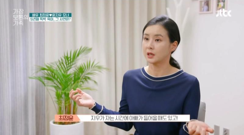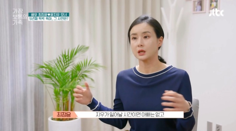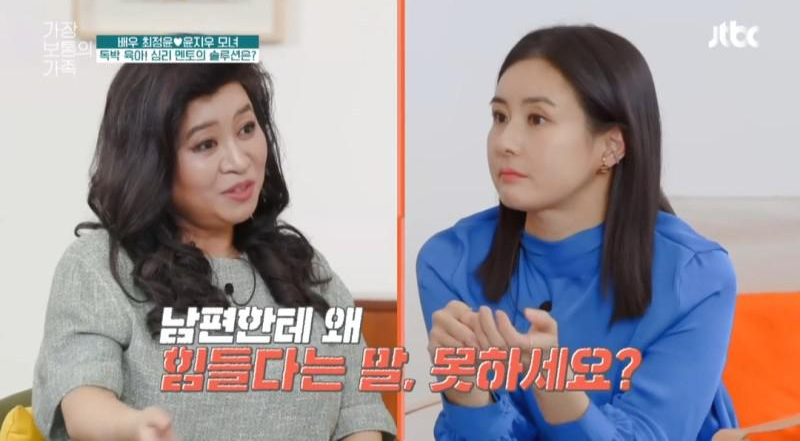 "남편한데 왜 힘들다고 말하지 않느냐"는 정신건강의학과 전문의 오은영 박사의 질문에 당시 최정윤은 "남편이 '너만 애 키우냐'고 하니까 못한다"고 답해 안타까움을 자아냈습니다.