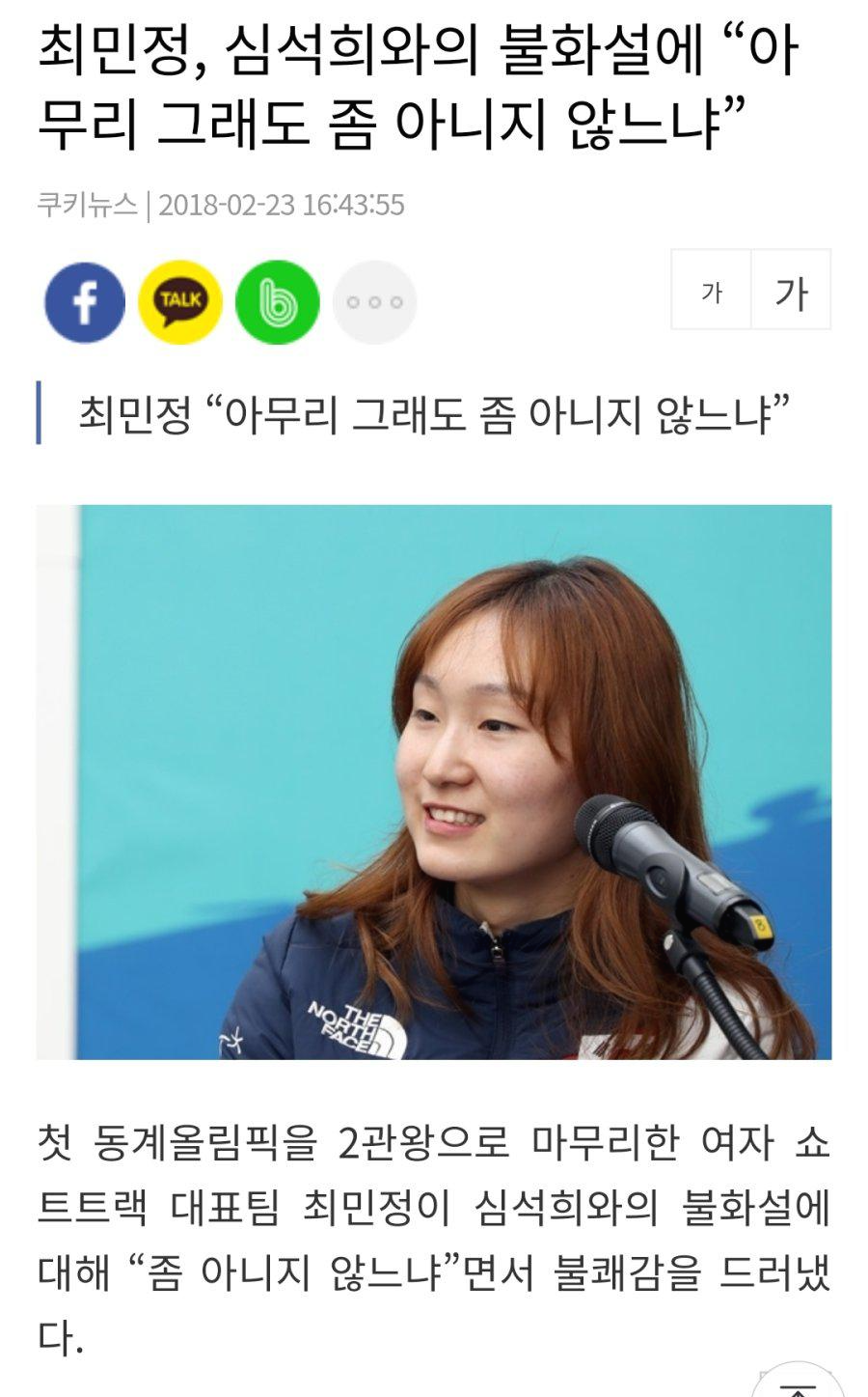 이로 인해 당시 심석희와 최민정 사이에 불화가 있다는 소문이 있었습니다. 1000m 경기가 끝난 다음 날 기자회견이 열렸는데 불화설에 대해 최민정은 "석희 언니와는 서운한 부분이 있어도 특별히 얘기할 것은 없다"고 대답했습니다.