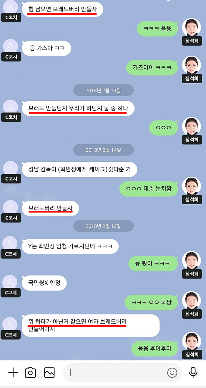 한 매체는 심석희와 코치 조항민이 평창올림픽 당시 나눈 카톡 메시지를 공개했는데요, 두 사람의 카톡 대화에는 "브래드버리 만들자"라는 말이 나옵니다.
