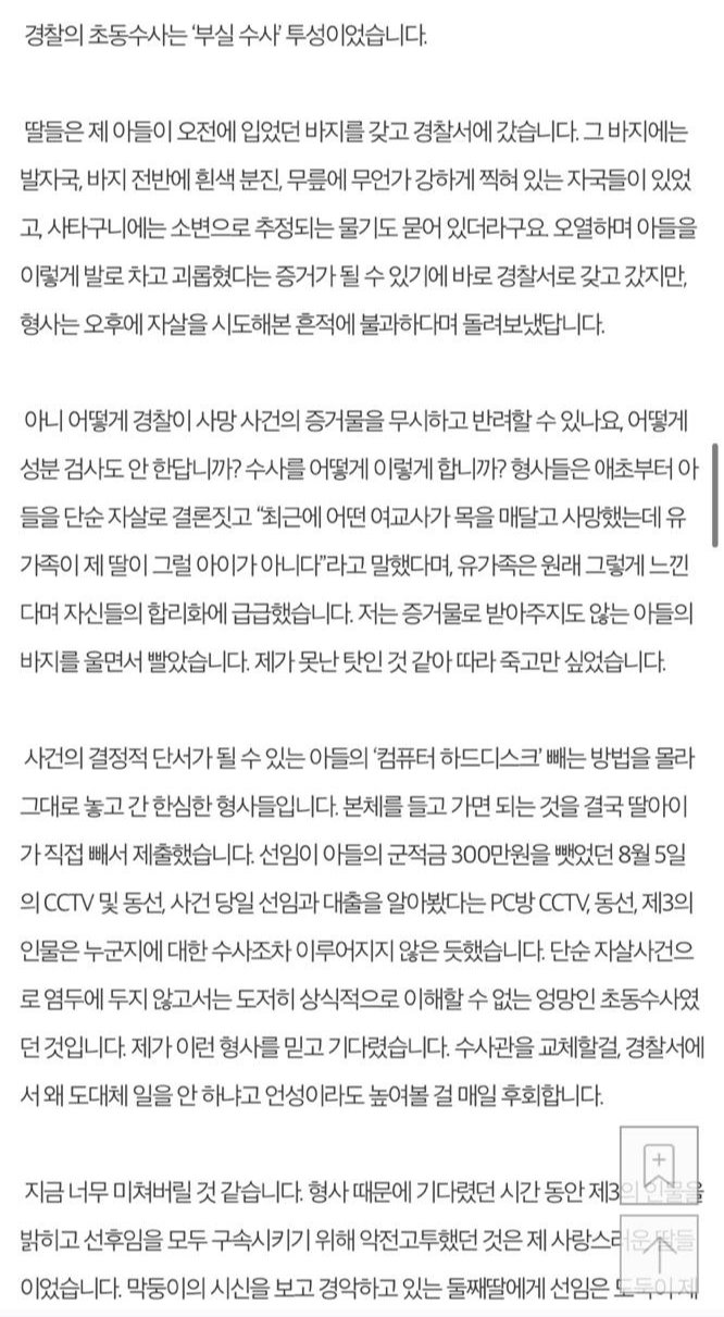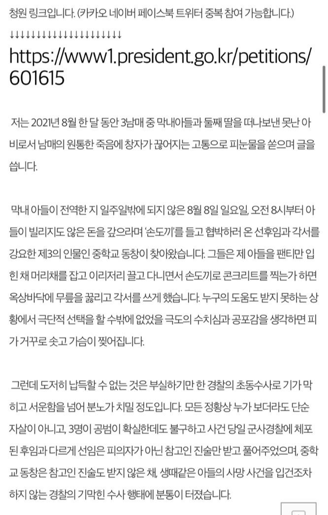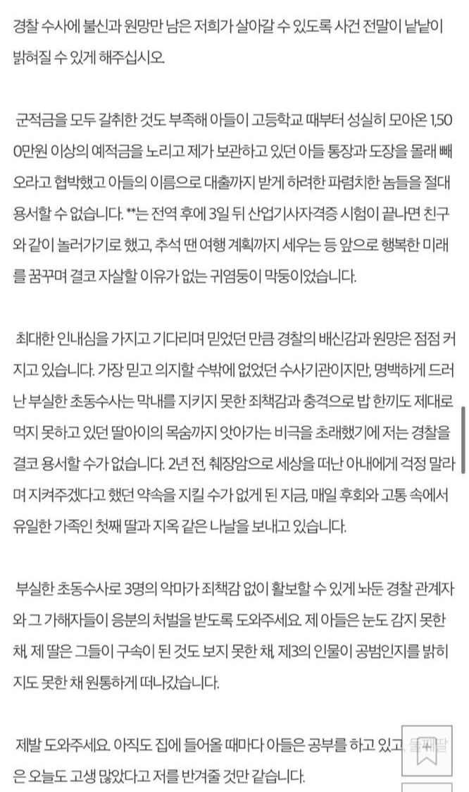 작성자는 이날 아들은 극단적 선택을 시도해 목숨을 잃었다고 밝히며, 아들이 극단적 선택을 시도한 것은 누가 봐도 단순 자살이 아니었음에도 경찰은 사건 당일 군사 경찰에 체포된 후임과 다르게 선임은 참고인 진술만 받고 풀어줬으며, 아들의 중학교 동창은 입건조차 하지 않았다고 밝혔습니다.
