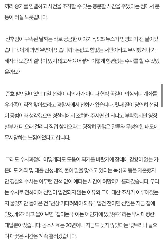 사건의 증거를 찾아 동분서주하던 둘째 딸은 같은 달 돌연사를 했다고 안타까운 사연을 전했습니다.