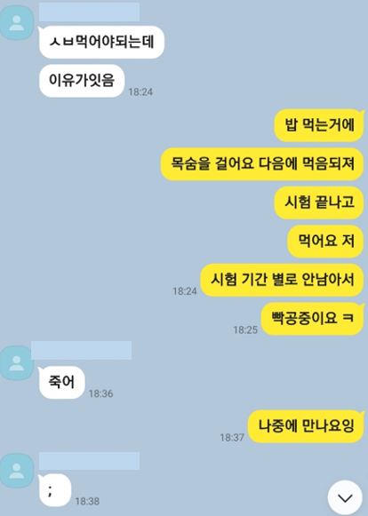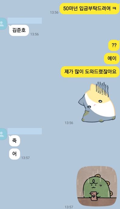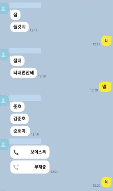 아래는 서산 손도끼 사건의 피해자 김준호의 누나가 한 온라인 커뮤니티에 올린 김준호와 선임의 카톡 대화 내용입니다.