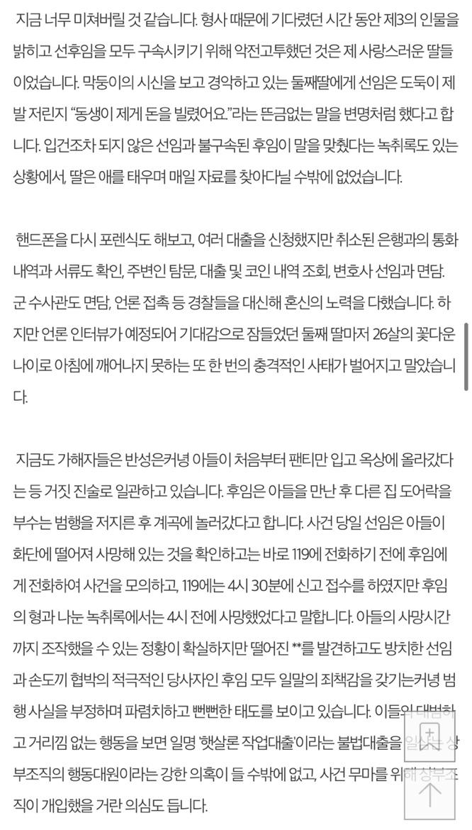 사건의 증거를 찾아 동분서주하던 둘째 딸은 같은 달 돌연사를 했다고 안타까운 사연을 전했습니다.