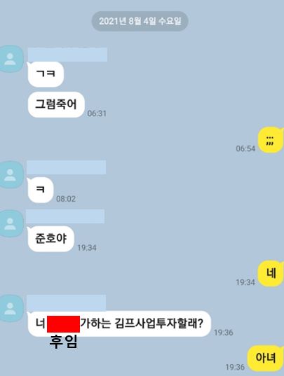 아래는 서산 손도끼 사건의 피해자 김준호의 누나가 한 온라인 커뮤니티에 올린 김준호와 선임의 카톡 대화 내용입니다.