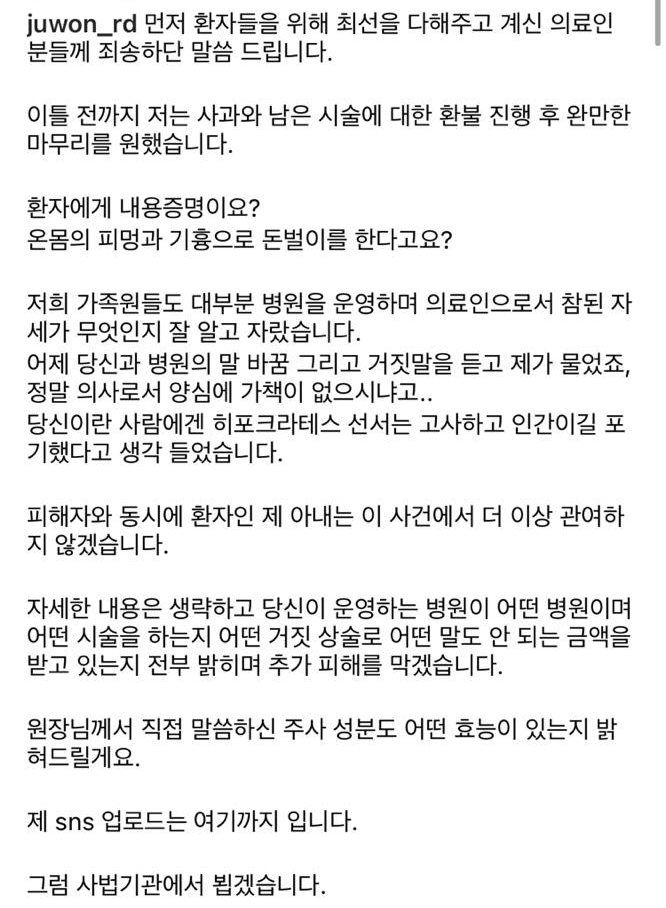 이에 아옳이 남편 서주원은 "저는 완만한 마무리를 원했다. 자세한 내용은 생략하고 당신이 운영하는 병원이 어떤 병원이며 어떤 시술을 하는 어떤 거짓 상술로 어떤 말도 안 되는 금액을 받고 있는지 전부 밝혀 추가 피해자를 막겠다"고 설명했습니다.