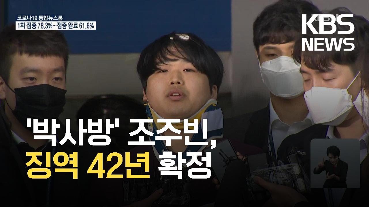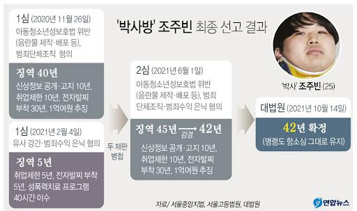 미성년자 성 착취물 제작 후 인터넷 메신저 텔레그램의 박사방을 통해 유포함 혐의로 재판에 넘겨진 조주빈이 징역 42년형을 선고받았습니다.