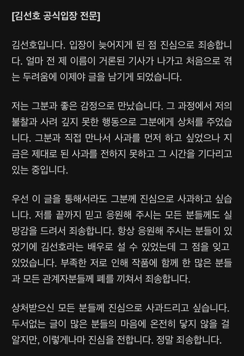 김선호는 "입장이 늦어지게 된 점 진심으로 죄송하다. 얼마 전 제 이름이 거론된 기사가 나가고 처음으로 겪는 두려움에 이제야 글을 남기게 됐다"라고 시작하는 장문의 글을 전했습니다.