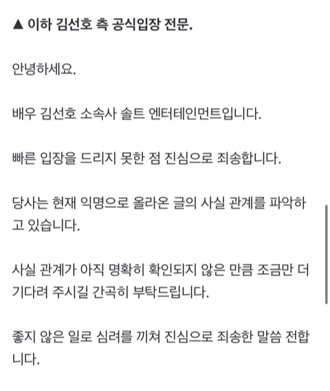 김선호는 "입장이 늦어지게 된 점 진심으로 죄송하다. 얼마 전 제 이름이 거론된 기사가 나가고 처음으로 겪는 두려움에 이제야 글을 남기게 됐다"라고 시작하는 장문의 글을 전했습니다.