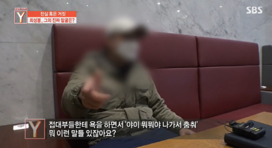 최성봉과 동업을 계획했다는 사람은 최성봉의 제안에 퇴폐업소를 간 적이 있다며 "사람들 만나면 술 먹고 2차 3차 마지막 단란주점 가는 게 코스였던 걸로 기억한다"고 폭로하기도 했습니다.