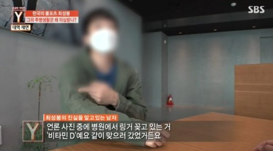 최성봉의 사업 파트너였다고 밝힌 지인은 "병원에서 링거 꽂고 있는 건 비타민D 주사다 저랑 같이 맞은거였다"라고 밝혔습니다.