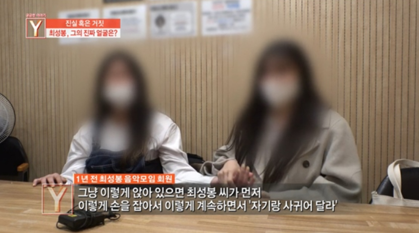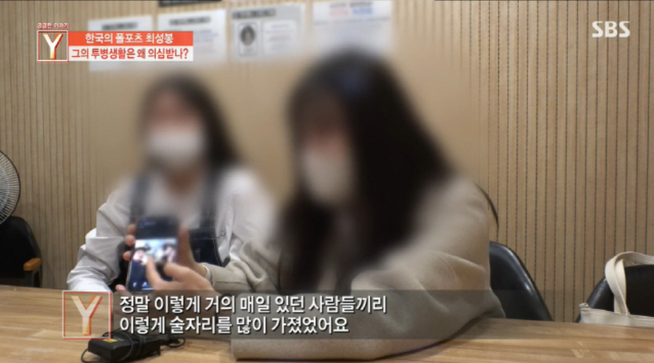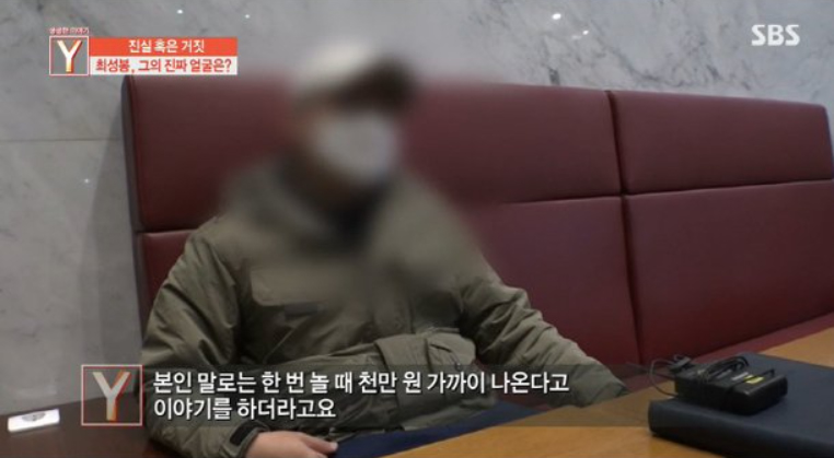최성봉과 동업을 계획했다는 사람은 최성봉의 제안에 퇴폐업소를 간 적이 있다며 "사람들 만나면 술 먹고 2차 3차 마지막 단란주점 가는 게 코스였던 걸로 기억한다"고 폭로하기도 했습니다.