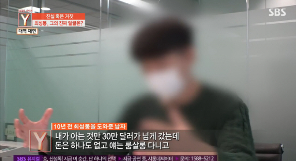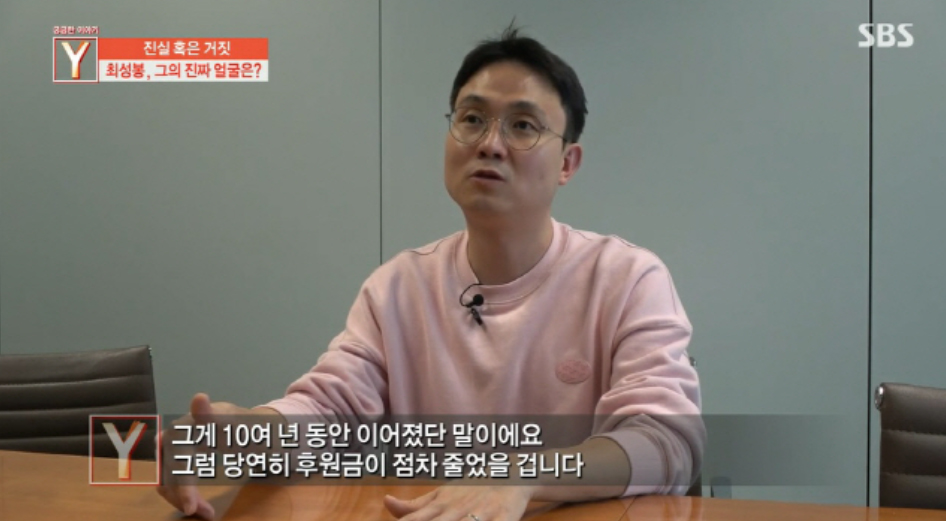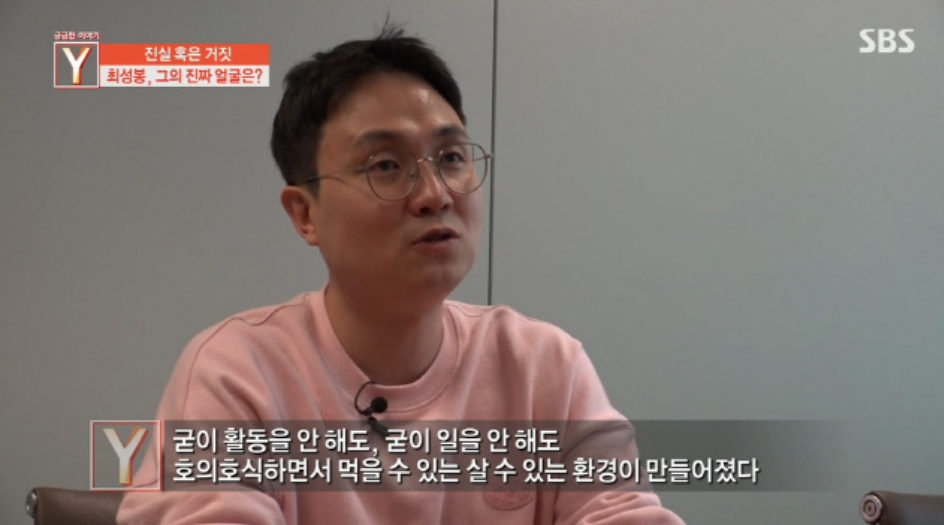 최성봉의 거짓 암 투병 의혹을 최초로 제기한 유튜버 이진호는 "2011년에 3억 원의 후원금을 받고 난 후 이렇게 된 것 같다. 굳이 활동을 안 해도 호의호식할 수 있는 환경이 만들어진 거다"라고 말했습니다.